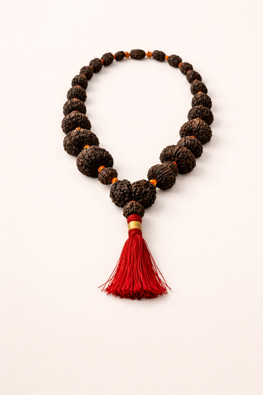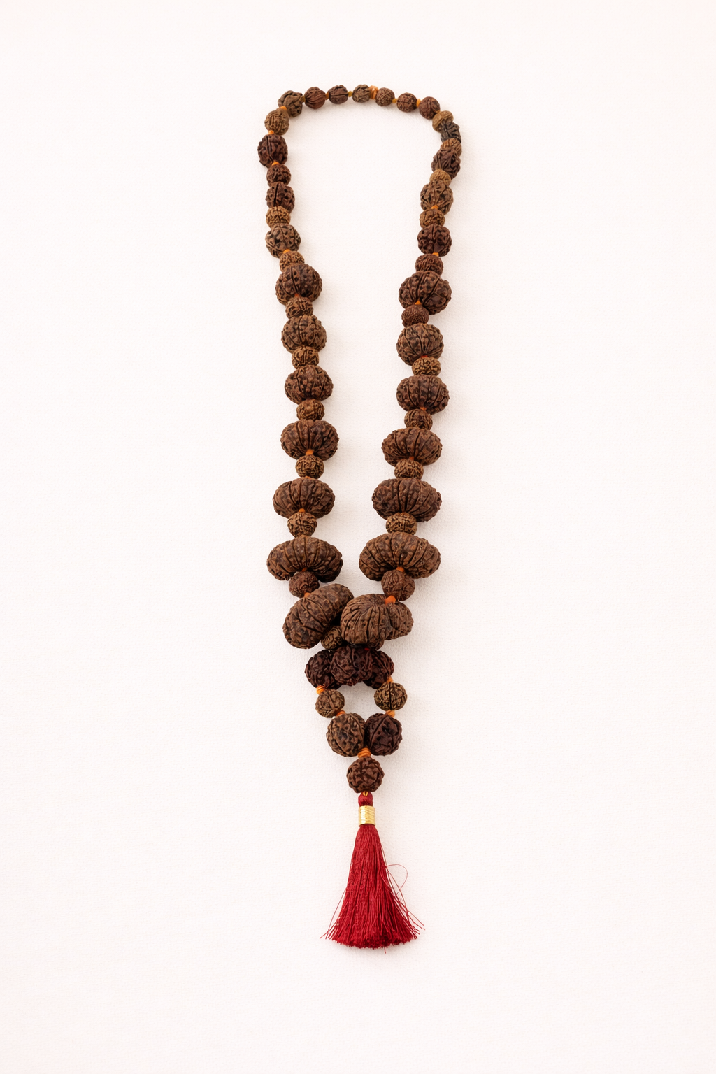 A beautifully crafted Indra Mala made from authentic Rudraksha beads arranged in a traditional pattern of large and small beads, valued for its spiritual significance and ideal for meditation and positive energy.